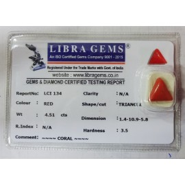 REPORT NO . LCI 134CLARITY . N/ACOLOUR . REDSHAPE / CUT . TRIANGLEWT . 4.51 CTSDIMENSION . 1-4.10-9.5-8.R . INDEX . N/AHARDNESS . 3.5COMMENT . CORAL..
