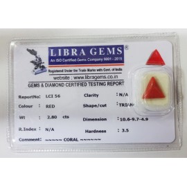 REPORT NO. LCI 56CLARITY. N/ACOLOUR. REDSHAPE/CUT. TRIANGLEWT. 2.80 CTSDIMENSION. 10.6-9.7-4.9R.INDEX. N/AHARDNESS. 3.5COMMENT. CORAL..