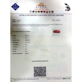 REPORT.NO.LCI 482CLARITY.N/ACOLOUR.REDSHAPE/CUT.CAPSULEWT.5.10 CTSDIMENSION.5.2-7.9-5.3R.INDEX.N/AHARDNESS.3.5COMMENT.CORAL..