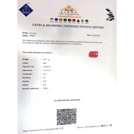 REPORT NO . LCI 292CLARITY . N/ACOLOUR . REDSHAPE / CUT . CAPSULEWT . 4.24 CTSDIMENSION . 4-8.5-8.6-7.R . INDEX . N/AHARDNESS . 3.5COMMENT . CORAL..