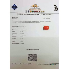 REPORT.NO.LCI 743CLARITY.N/ACOLOUR.REDSHAPE/CUT.CAPSULE WT.5.83 CTSDIMENSION.9.8-5.9-5.5R.INDEX.N/AHARDNESS.3.5COMMENT.CORAL..