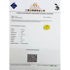 REPORT NO . LY 305CLARITY . N/ACOLOUR . YELLOWSHAPE / CUT . OVALWT . 5.12 CTSDIMENSION . 10-7.8-9.5-1.R . INDEX . 1.76-1.78HARDNESS . 9.0COMMENT . YELLOW SAPPHIRE..