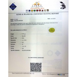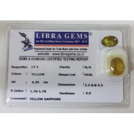 REPORT NO . LY 5CLARITY . N/ACOLOUR . YELLOWSHAPE / CUT . OVALWT . 6.39 CTSDIMENSION . 2-2.8-8.5-5.R . INDEX . 1.76-1.78HARDNESS . 9.0COMMENT . YELLOW SAPPHIRE..