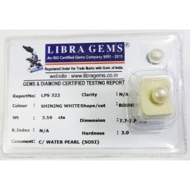 REPORT.NO.-LPS 322CLARITY.-N/ACOLOUR.-SHINING WHITESHAPE/CUT.-ROUNDWT.-3.59 CTSDIMENSION.-7-7.7-8.7-9.R.INDEX.-N/AHARDNESS.-3.0COMMENT.-C / WATER PEARL { SOSI }..