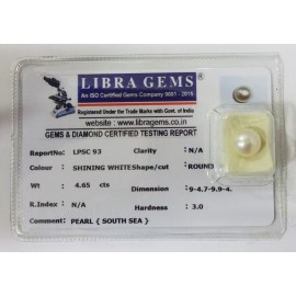 REPORT NO . LPSC 93CLARITY . N/ACOLOUR . SHINING WHITESHAPE / CUT . ROUNDWT . 4.65 CTSDIMENSION . 9-4.7-9.9-4.R . INDEX . N/AHARDNESS . 3.0COMMENT . PEARL { SOUTH SEA }..