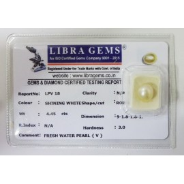 REPORT NO . LPV18CLARITY . N/ACOLOUR . SHINING WHITESHAPE / CUT . ROUNDWT . 4.45 CTSDIMENSION . 9-1.8-1.8-1.R . INDEX . N/AHARDNESS . 3.0COMMENT . FRESH WATER PEARL { V }..