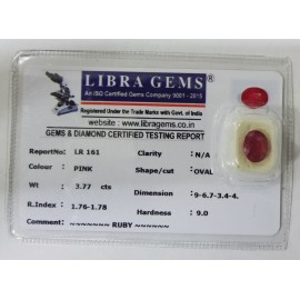 REPORT NO . LR 161CLARITY . N/ACOLOUR . PINKSHAPE / CUT . OVALWT . 3.77 CTSDIMENSION . 9-6.7-3.4-9.R . INDEX . 1.76-1.78HARDNESS . 9.0COMMENT . RUBY..