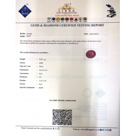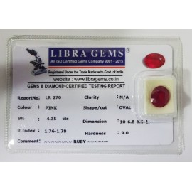 REPORT NO . LR 270CLARITY . N/ACOLOUR . PINKSHAPE / CUT . OVALWT . 4.35 CTSDIMENSION . 10-6.8-8.5-1.R . INDEX . 1.76-1.78HARDNESS . 9.0COMMENT . RUBY..