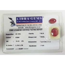 REPORT.NO.-LR 361CLARITY.-N/ACOLOUR.-PINKSHAPE/CUT.-OVALWT.-9.42 CTSDIMENSION.-2.4-10.1-7.2R.INDEX.-1.76-1.78HARDNESS.-9.0COMMENT.-RUBY..