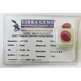 REPORT.NO.-LRA 126CLARITY.-N/ACOLOUR.-PINKSHAPE/CUT.-OVALWT.-13.86 CTSDIMENSION.-3-1.1-1.8-4.R.INDEX.-1.76-1.78HARDNESS.-9.0COMMENT.-RUBY { A }..
