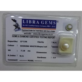 REPORT NO . LP 536CLARITY . N/ACOLOUR . SHINING WHITESHAPE / CUT .ROUNDWT . 7.18 CTSDIMENSION . 10-4.10-5.7-8.R . INDEX . N/AHARDNESS . 3.0COMMENT . PEARL..
