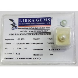 REPORT.NO.-LPS 255CLARITY.-N/ACOLOUR.-SHINING WHITESHAPE/CUT.-ROUNDWT.-3.94 CTSDIMENSION.-8-1.8-1.8-5.R.INDEX.-N/AHARDNESS.-3.0COMMENT.-C / WATER PEARL { SOSI }..