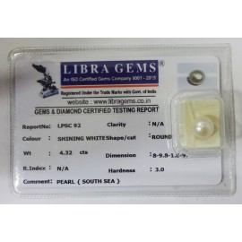 REPORT NO . LPSC 92CLARITY . N/ACOLOUR . SHINING WHITESHAPE / CUT . ROUNDWT . 4.32 CTSDIMENSION . 8-9.8-1.8-9.R . INDEX . N/AHARDNESS . 3.0COMMENT . PEARL { SOUTH SEA }..