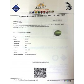 REPORT.NO.-LC 576CLARITY.-N/ACOLOUR.-GREENSHAPE/CUT.-OVALWT.-14.02 CTSDIMENSION.-5-2.3-1.9-9.R.INDEX.-1.54-1.55HARDNESS.-7.5COMMENT.-CATS EYE { S. QUARTZ }..