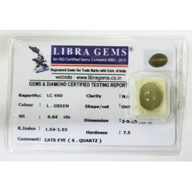 REPORT NO . LC 26CLARITY . N/ACOLOUR . L . GREENSHAPE / CUT . OVALWT . 6.64 CTSDIMENSION . 10-8.6-3.3-8.R . INDEX . 1.54-1.55HARDNESS . 7.5COMMENT . CATS EYE { S . QUARTZ }..