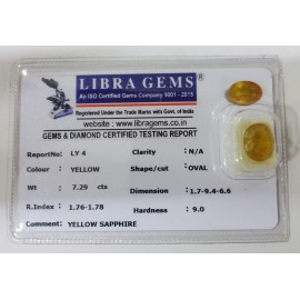 REPORT NO . LY 4CLARITY . N/ACOLOUR . YELLOWSHAPE / CUT . OVALWT . 7.29 CTSDIMENSION . 1-7.9-4.6-6.R . INDEX . 1.76-1.78HARDNESS . 9.0COMMENT . YELLOW SAPPHIRE..