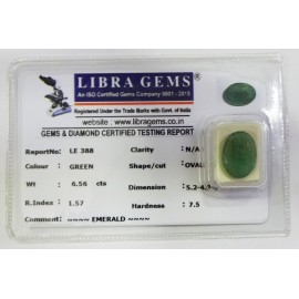 REPORT.NO.LE 388CLARITY.N/ACOLOUR.GREENSHAPE/CUT.OVALWT.6.56 CTSDIMENSION. 5-2.4-9.1-1.R.INDEX.1.57HARDNESS.7.5COMMENT.EMERALD..