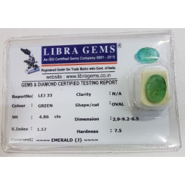 REPORT NO . LEJ 33CLARITY . N/ACOLOUR . GREENSHAPE / CUT . OVALWT . 4.86 CTSDIMENSION . 2-9.9-2.6-5.R . INDEX . 1.57HARDNESS . 7.5COMMENT . EMERALD ( J )..