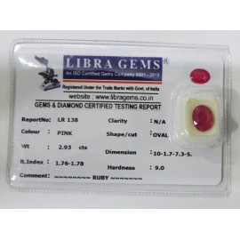REPORT NO . LR 138CLARITY . N/ACOLOUR . PINKSHAPE / CUT . OVALWT . 2.93 CTSDIMENSION . 10-1.7-7.3-5.R . INDEX . 1.76-1.78HARDNESS . 9.0COMMENT . RUBY..