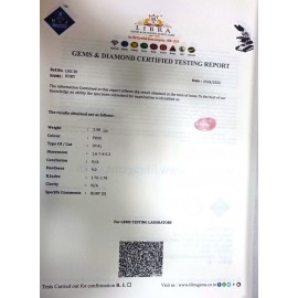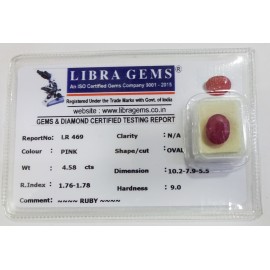REPORT.NO.-LR 469CLARITY.-N/ACOLOUR.-PINKSHAPE/CUT.-OVALWT.-4.58 CTSDIMENSION.-10-2.7-9.5-5.R.INDEX.-1.76-1.78HARDNESS.-9.0COMMENT.-RUBY..