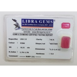 REPORT NO . LRA 12CLARITY . N/ACOLOUR . PINKSHAPE / CUT . RECTANGLEWT . 8.21 CTSDIMENSION . 5-3.1-4.3-5.R . INDEX . 1.76-1.78HARDNESS .9.0COMMENT . RUBY { A }..
