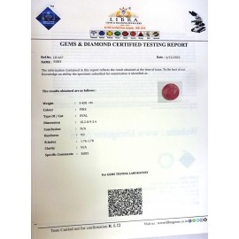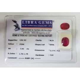 REPORT NO . LRA 62CLARITY . N/ACOLOUR . PINKSHAPE / CUT . OVALWT . 3.95 CTSDIMENSION . 1-1.9-1.4-1.R . INDEX . 1.76-1.78HARDNESS . 9.0COMMENT . RUBY { A }..