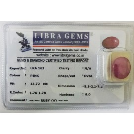 REPORT.NO.-LRA 161CLARITY.-N/ACOLOUR.-PINKSHAPE/CUT.-OVALWT.-13.72 CTSDIMENSION.-5-1.2-1.7-2.R.INDEX.-1.76-1.78HARDNESS.-9.0COMMENT.-RUBY { A }..