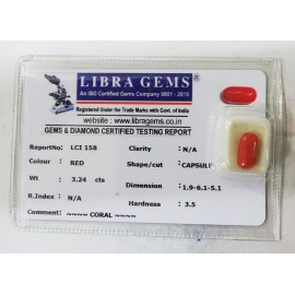 REPORT NO . LCI 158CLARITY . N/ACOLOUR . REDSHAPE / CUT . CAPSULEWT . 3.24 CTSDIMENSION . 1-9.6-1.5-1.R . INDEX . N/AHARDNESS . 3.5COMMENT . CORAL..