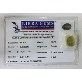 REPORT.NO.-LC 639CLARITY.-N/ACOLOUR.-L.GREENSHAPE/CUT.-OVALWT.-7.28 CTSDIMENSION.-2-2.10-6.8-1.R.INDEX.-1.54-1.55HARDNESS.-7.5COMMENT.-CATS EYE { S . QUARTZ }..