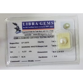 REPORT NO . LP 1075CLARITY . N/ACOLOUR . SHINING WHITESHAPE / CUT . ROUNDWT . 4.37 CTSDIMENSION . 8-9.6-8.8-9.R . INDEX . N/AHARDNESS . 3.0COMMENT . PEARL..
