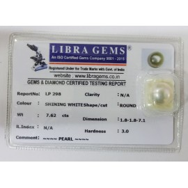 REPORT NO . LP 298CLARITY . N/ACOLOUR . SHINING WHITESHAPE / CUT . ROUNDWT . 7.62 CTSDIMENSION . 1-8.1-8.7-1.R . INDEX . N/AHARDNESS . 3.0COMMENT . PEARL..