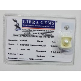 REPORT NO . LP 609CLARITY . N/ACOLOUR . SHINING WHITESHAPE / CUT . ROUNDWT . 3.60 CTSDIMENSION . 8-2.8-2.6-7.R . INDEX . N/AHARDNESS . 3.0COMMENT . PEARL..