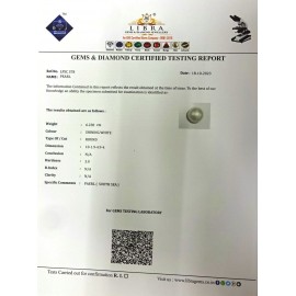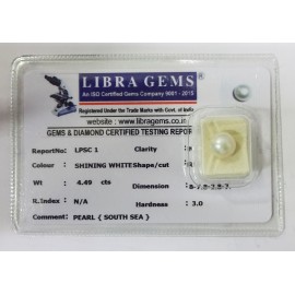 REPORT NO . LPSC 1CLARITY . N/ACOLOUR . SHINING WHITESHAPE / CUT . ROUNDWT . 4.49 CTSDIMENSION . 8-7.8-2.8-7.R . INDEX . N/AHARDNESS . 3.0COMMENT . PEARL { SOUTH SEA }..