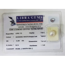 REPORT NO . LPSC 75CLARITY . N/ACOLOUR . SHINING WHITESHAPE / CUT . ROUNDWT . 5.09 CTSDIMENSION . 9-3.9-1.9-1.R . INDEX . N/AHARDNESS . 3.0COMMENT . PEARL { SOUTH SEA }..