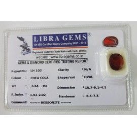 REPORT NO . LH 103CLARITY . N/ACOLOUR . COCA COLASHAPE / CUT . OVALWT . 3.64 CTSDIMENSION . 10-7.9-1.4-1.R . INDEX . 1.92-2.02HARDNESS . 6.5-7.5COMMENT . HESSONITE..