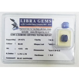 REPORT.NO.LN 671CLARITY.N/ACOLOUR.BLUESHAPE/CUT.RECTANGLE WT.4.61 CTSDIMENSION.8.4-7.9-6.6R.INDEX.1.76-1.7.8HARDNESS.9.0COMMENT.BLUE SAPPHIRE..