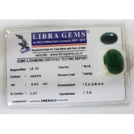 REPORT NO . LE 35CLARITY . N/ACOLOUR . GREENSHAPE / CUT . OVALWT . 8.93 CTSDIMENSION . 7-1.2-8.5-5.R . INDEX . 1.57HARDNESS . 7.5COMMENT . EMERALD ..