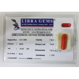 REPORT NO . LCI 219CLARITY . N/ACOLOUR . REDSHAPE / CUT . CAPSULEWT . 4.35 CTSDIMENSION . 7-7.5-6.4-7.R . INDEX . N/AHARDNESS . 3.5COMMENT . CORAL..