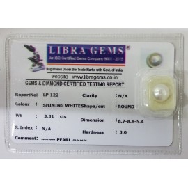 REPORT NO . LP 122CLARITY . N/ACOLOUR . SHINING WHITESHAPE / CUT . ROUNDWT . 3.31 CTSDIMENSION . 8-7.8-8.5-4.R . INDEX . N/AHARDNESS . 3.0COMMENT . PEARL..