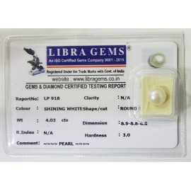 REPORT NO . LP 831CLARITY . N/ACOLOUR . SHINING WHITESHAPE / CUT . ROUNDWT . 4.24 CTSDIMENSION . 9-1.6-7.9-1.R . INDEX . N/AHARDNESS . 3.0COMMENT . PEARL..