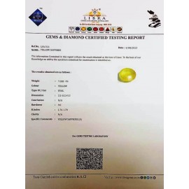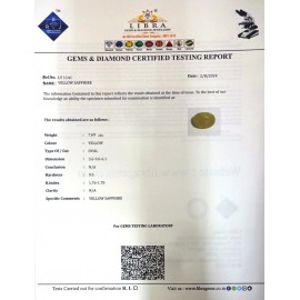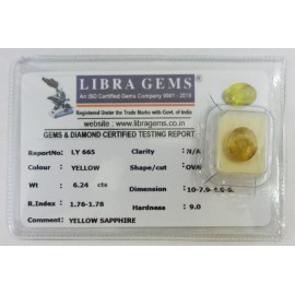 REPORT.NO.-LY 665CLARITY.-N/ACOLOUR.-YELLOWSHAPE/CUT.-OVAWT.-6.24 CTSDIMENSION.-10-7.9-4.6-6.R.INDEX.-1.76-1.78HARDNESS.-9.0COMMENT.-YELLOW SAPPHIRE..