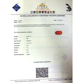 REPORT NO . LCI 292CLARITY . N/ACOLOUR . REDSHAPE / CUT . CAPSULEWT . 4.24 CTSDIMENSION . 4-8.5-8.6-7.R . INDEX . N/AHARDNESS . 3.5COMMENT . CORAL..