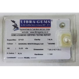 REPORT NO . LP 63CLARITY . N/ACOLOUR . SHINING WHITESHAPE / CUT . ROUNDWT . 5.53 CTSDIMENSION . 10-1.6-7.10-1.R . INDEX . N/AHARDNESS . 3.0COMMENT . PEARL..