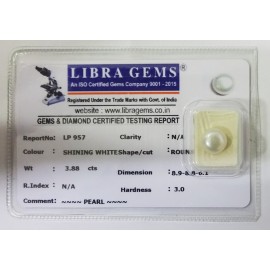 REPORT NO . LP 957CLARITY . N/ACOLOUR . SHINING WHITESHAPE / CUT . ROUNDWT . 3.88 CTSDIMENSION . 8-9.8-8.6-1.R . INDEX . N/AHARDNESS . 3.0COMMENT . PEARL..