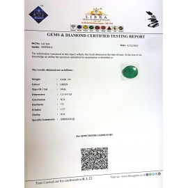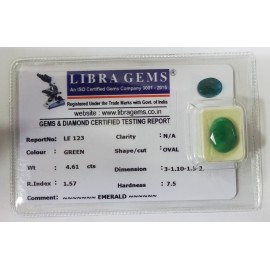 REPORT NO . LE 123CLARITY . N/ACOLOUR . GREENSHAPE / CUT . OVALWT . 4.61 CTSDIMENSION . 3-1.10-1.5-3.R . INDEX . 1.57HARDNESS . 7.5COMMENT . EMERALD..