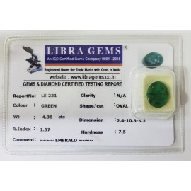 REPORT.NO.-LE 221CLARITY.-N/ACOLOUR.-GREENSHAPE/CUT.-OVALWT.-4.38 CTSDIMENSION.-2-4.10-5.5-2.R.INDEX.-1.57HARDNESS.-7.5COMMENT.-EMERALD..