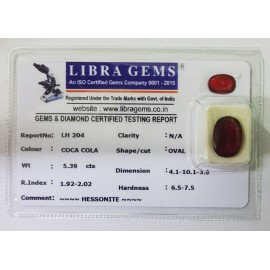 REPORT.NO.-LH 204CLARITY.-N/ACOLOUR.-COCA COLASHAPE/CUT.-OVALWT.-5.39 CTSDIMENSION.-4.1-10.1-3.9R.INDEX.-1.92-2.02HARDNESS.-6.5-7.5COMMENT.-HESSONITE..