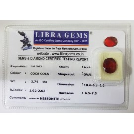 REPORT.NO.-LH 367CLARITY.-N/ACOLOUR.-COCA COLASHAPE/CUT.-OVALWT.-3.74 CTSDIMENSION.-10-6.8-7.4-6.R.INDEX.-1.92-2.02HARDNESS.-6.5-7.5COMMENT.-HESSONITE..