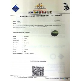 REPORT NO . LC 10CLARITY . N/ACOLOUR . L . GREENSHAPE / CUT . OVALWT . 5.54 CTSDIMENSION . 1-8.9-1.7-2.R . INDEX . 1.54-1.55HARDNESS . 7.5COMMENT . CATS EYE { S . QUARTZ }..