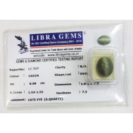 REPORT.NO.-LC 327CLARITY.-N/ACOLOUR.-GREENSHAPE/CUT.-OVALWT.-8.68 CTSDIMENSION.-3-9.1-1.7-9.R.INDEX.-1.54-1.55HARDNESS.-7.5COMMENT.-CATS EYE { S . QUARTZ }..